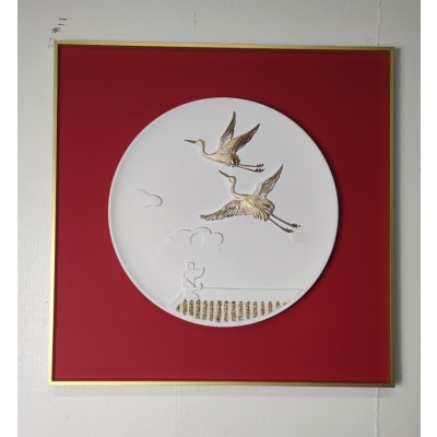 The crane goes east, real object painting, 3D Relief (3D Relief, paint, gold foil hand painting)